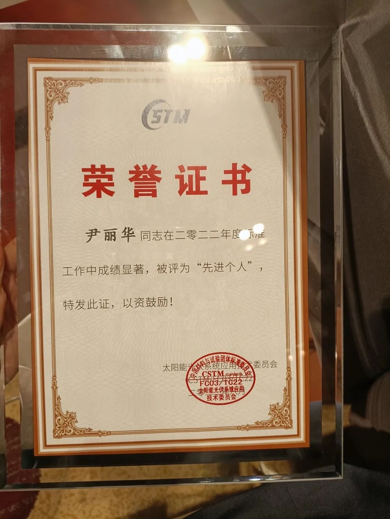 8月23日-24日,中国材料与试验团体标准委员会标准研讨会在无锡举行。会上,英利集团旗下专业的光伏建筑一体化(BIPV)企业——保定嘉盛光电科技股份有限公司(以下称“英利嘉盛”)斩获“2022年度标准制定先进单位”称号,标准工作负责人尹丽华同志凭借个人突出成绩,被评为“先进个人”。